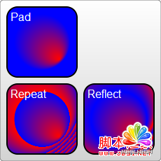 另外一個可能用到的屬性是spreadMethod屬性,這個屬性定義了漸變色到達它的終點時應該采取的行為。該屬性有3個可選值:pad(默認值),reflect,repeat。pad不用說了,屬于自然過渡,漸變色結(jié)束以后,使用最后一個成員色直接渲染對象剩下的部分。refect會讓漸變色繼續(xù),只不過漸變色會反向繼續(xù)渲染,從最后一個顏色開始到第一個顏色這個順序渲染;等到再次到達漸變色終點時,再反序,如此這般指導對象填充完畢。repeat也會讓漸變色繼續(xù)渲染,但是不會反序,還是一遍一遍從第一種顏色到最后一種顏色渲染。效果圖如下所示: