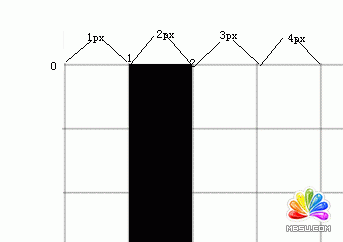 但遺憾的是canvas的線條畫法不一樣,上一篇文章我們已經(jīng)說了,canvas的每條線都有一條無限細(xì)的“中線”,線條的寬度是從中線向兩側(cè)延伸的。如果我們還是從第2個像素點畫一條線,那么線條的中線就會靠齊到第2個像素的起點,然后我們開始畫了,問題也就來了:Canvas 的線條以中線向兩側(cè)延伸,而不是向某一邊延伸(比如這里,如果只是往右側(cè)延伸,那么我們的問題就不再是問題了),延伸過后我們的線條實際上是這樣的: