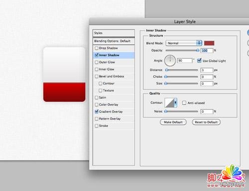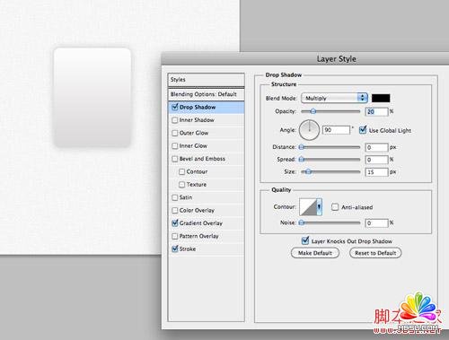最后添加向下的陰影效果,透明度為20%,0像素的距離和15像素的大小。這些效果在css中將會(huì)用box-shadow屬性實(shí)現(xiàn)。