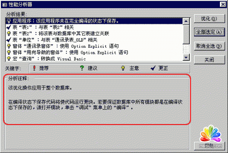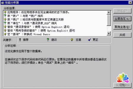 并且單擊這個(gè)選項(xiàng)卡上的“全部選定”按鈕,這樣雖然會(huì)使我們多花一些時(shí)間進(jìn)行性能分析,但卻是非常值得的。完成這些后,單擊這個(gè)選項(xiàng)卡上的“確定”按鈕,現(xiàn)在ACCESS就開(kāi)始為我們的數(shù)據(jù)庫(kù)進(jìn)行優(yōu)化分析了。