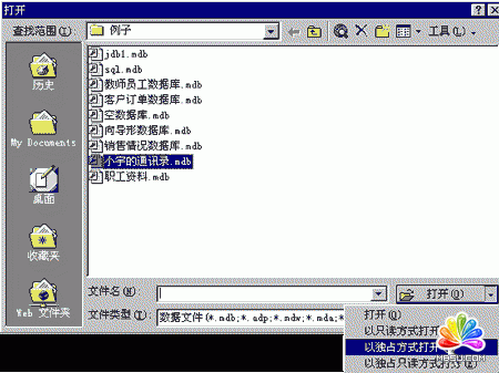 在這個(gè)對(duì)話框中選擇需要打開(kāi)的數(shù)據(jù)庫(kù),然后將鼠標(biāo)移動(dòng)到這個(gè)對(duì)話框中“打開(kāi)”按鈕右面的向下按鈕。在彈出的菜單中選擇“以獨(dú)占方式打開(kāi)”,并單擊這個(gè)選項(xiàng)。