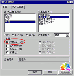 在這個(gè)對(duì)話框中,我們可以更改不同用戶(hù)對(duì)數(shù)據(jù)庫(kù)或其中的某個(gè)對(duì)象的訪問(wèn)權(quán)限。假如我們想使用戶(hù)李明只能打開(kāi)運(yùn)行數(shù)據(jù)庫(kù)的窗體,而不想要他能打開(kāi)其他的表或查詢(xún),只需要先在用戶(hù)名中選擇“李明”,然后在對(duì)象類(lèi)型下拉框中選擇“窗體”,現(xiàn)在選擇一個(gè)窗體,完后將鼠標(biāo)移動(dòng)到權(quán)限框中選中李明可有的“打開(kāi)/運(yùn)行”項(xiàng),完成這些后,單擊“確定”按鈕就可以使李明在使用中只能看到窗體,而不能修改其他的數(shù)據(jù)內(nèi)容了。也不能看到表或查詢(xún)了。