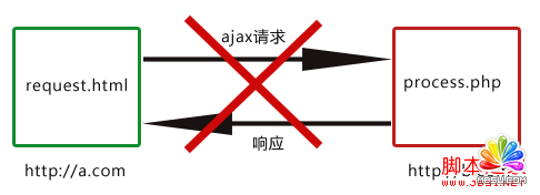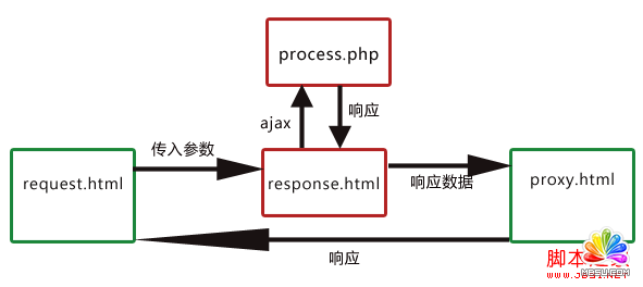 要實現(xiàn)域a.com的request.html請求域b.com的process.php,可以將請求的參數(shù)通過URL傳給response.html,由response.html向process.php發(fā)出真正的ajax請求(response.html與process.php都屬于域b.com),然后將返回的結(jié)果通過URL傳給proxy.html,最后由于proxy.html與request.html是在同一域下,所以可以在proxy.html利用window.top將結(jié)果返回給request.html完成跨域通信。