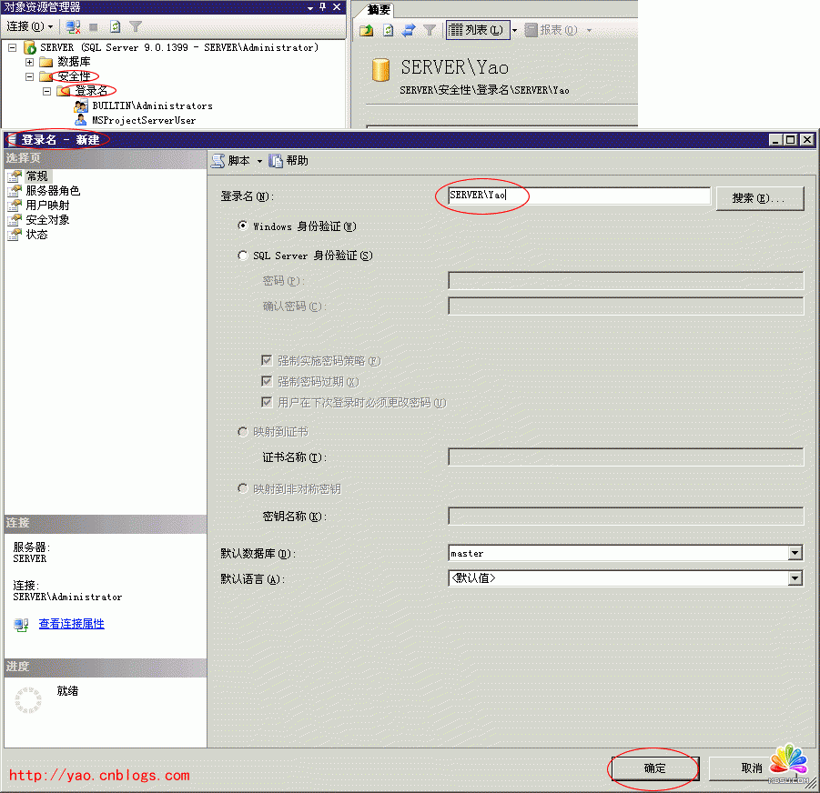 3. 在服務(wù)器上(我演示的服務(wù)器叫Server),將Windows帳號yao設(shè)置為SQL Server中sysadmin角色的成員;分為二步,先創(chuàng)建登錄,再加入sysadmin角色組;如下圖: