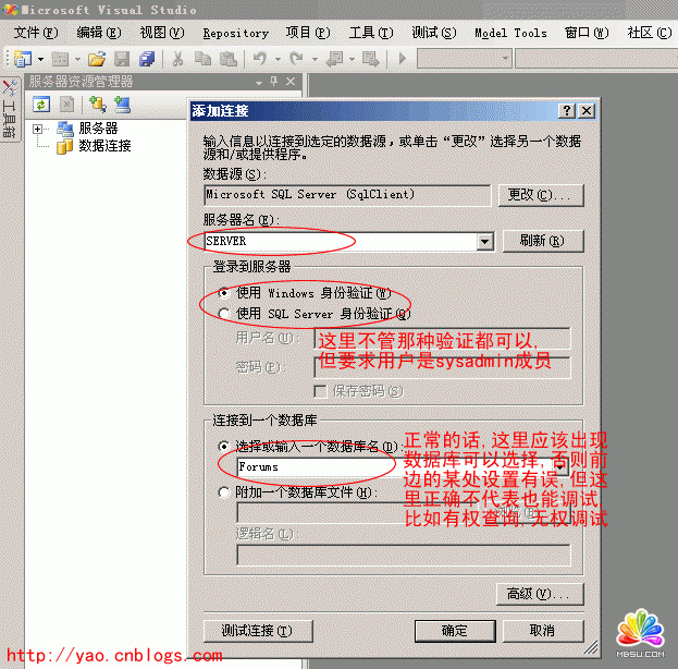 6. 注意1,5點所說帳戶的區(qū)別,一個是運行VS的帳戶,一個是連接SQL Server的帳戶,二者可以不相同。