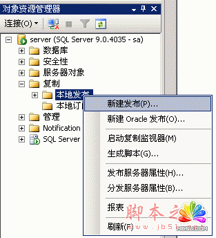 (1)首先我們?cè)诎l(fā)布服務(wù)器上(winserver2003)打開SqlServer2005 Management Studio (企業(yè)版)。在“對(duì)象資源管理器”中找到復(fù)制節(jié)點(diǎn),右鍵--->新建發(fā)布(注:如果你的SqlServer是express版本的話,是沒(méi)有發(fā)布這一功能的,只有訂閱功能!)