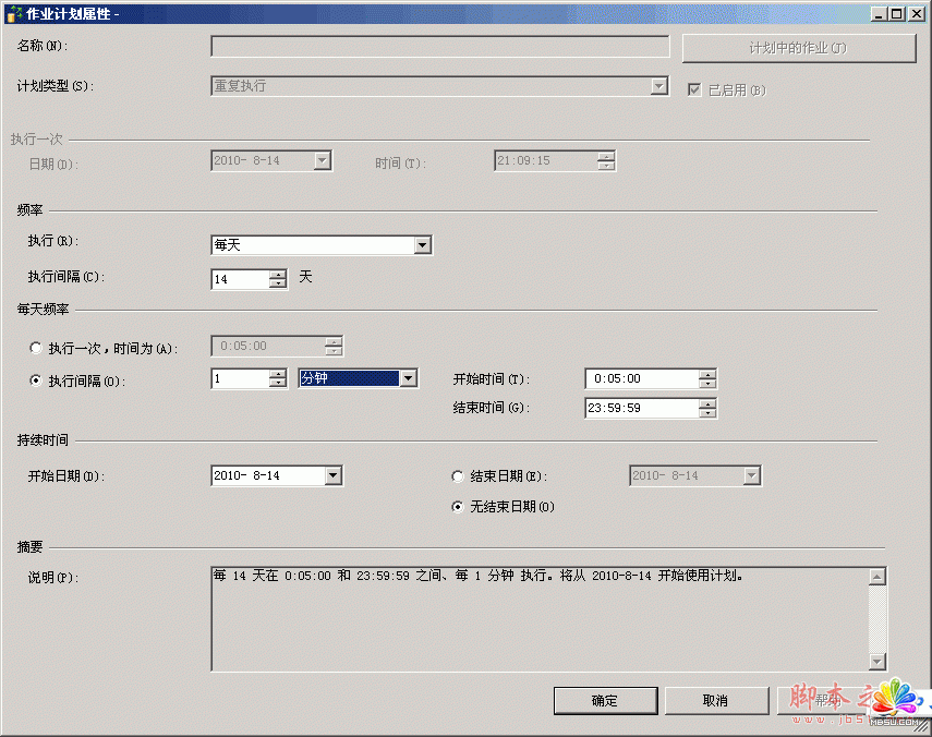 (5)接下來(lái)設(shè)置作業(yè)計(jì)劃,為了方便看到測(cè)試效果,我們?cè)O(shè)置“每隔一分鐘”執(zhí)行一次作業(yè)。
