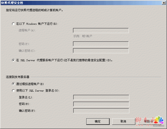 (6)設(shè)置快照代理安全性,連接到發(fā)布服務(wù)器時(shí),用模擬進(jìn)程即可。