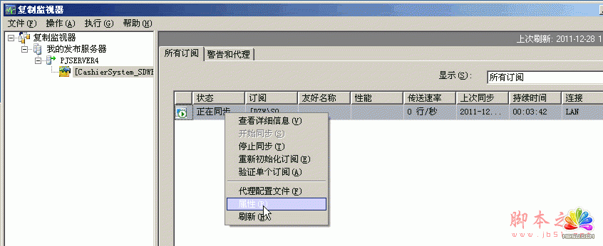 (2)展開“我的發(fā)布服務(wù)器”——>發(fā)布服務(wù)器機(jī)器名稱-——>發(fā)布名稱。在右側(cè)會(huì)看到訂閱服務(wù)器的狀態(tài)“正在同步”。右鍵,選擇“屬性”可以打開詳細(xì)說(shuō)明。