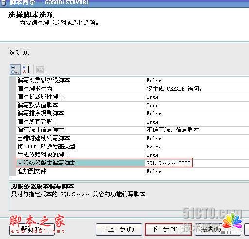 -- 在接下來的"選擇腳本選項"中, 找到"為服務器版本編寫腳本"項, 選擇"SQL Server 2000"