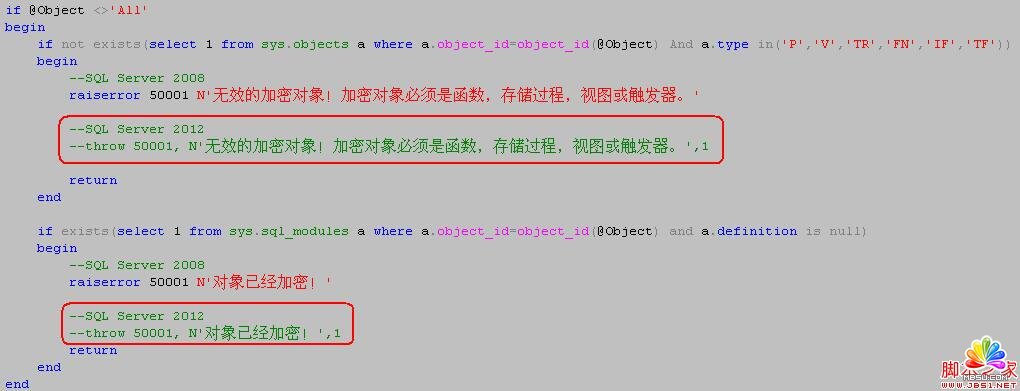 --throw 50001, N'無效的加密對(duì)象!加密對(duì)象必須是函數(shù),存儲(chǔ)過程,視圖或觸發(fā)器。',1