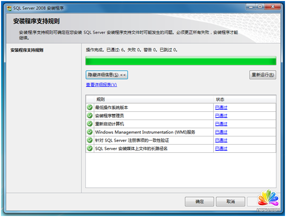 之后進(jìn)入“安裝程序支持規(guī)則”安裝界面,安裝程序?qū)⒆詣?dòng)檢測安裝環(huán)境基本支持情況,需要保證通過所有條件后才能進(jìn)行下面的安裝,如圖1-5所示。當(dāng)完成所有檢測后,點(diǎn)擊“確定”進(jìn)行下面的安裝。