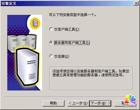 在 "安裝定義"窗口,選擇 "服務(wù)器和客戶端工具" 選項進行安裝。我們需要將服務(wù)器和客戶端同時安裝,這樣在同一臺機器上,我們可以完成相關(guān)的所有操作,對于我們學(xué)習(xí)SQL Server很有用處。如果你已經(jīng)在其它機器上安裝了SQL Server,則可以只安裝客戶端工具,用于對其它機器上SQL Server的存取。
