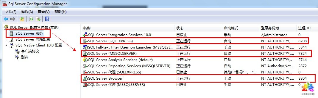 (6:選中左側(cè)的“SQL Server服務(wù)”,確保右側(cè)的“SQL Server”以及“SQL Server Browser”正在運(yùn)行