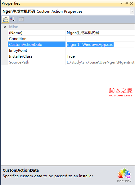 然后右擊新建的自定義操作,選擇屬性窗口,在屬性窗口的CustomActionData屬性中添加需要操作的程序集,注意CustomActionData是一個鍵值對,每個鍵值對以/開始