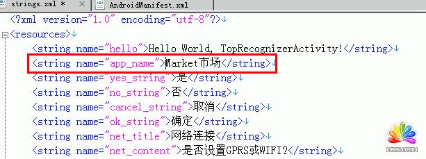 上圖中:label="@string/app_name" 表明在string.xml中string的name屬性為app_name的值,即為該APK的“軟件名稱”,這里是“Market市場”,如下圖所示: