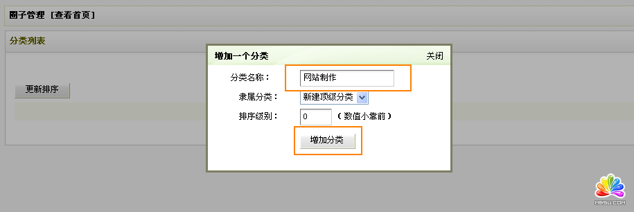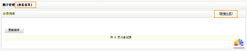 選擇“查看首頁”鏈接可在新窗口看到圏子在前臺的預覽效果(如圖5)。選擇“新增分類”鏈接,在彈層中輸入分類名稱如:網站建設。隸屬分類因當前沒有任何分類,只能新建頂級分類,選擇“增加分類”按鈕成功新增一個分類(如圖6)。