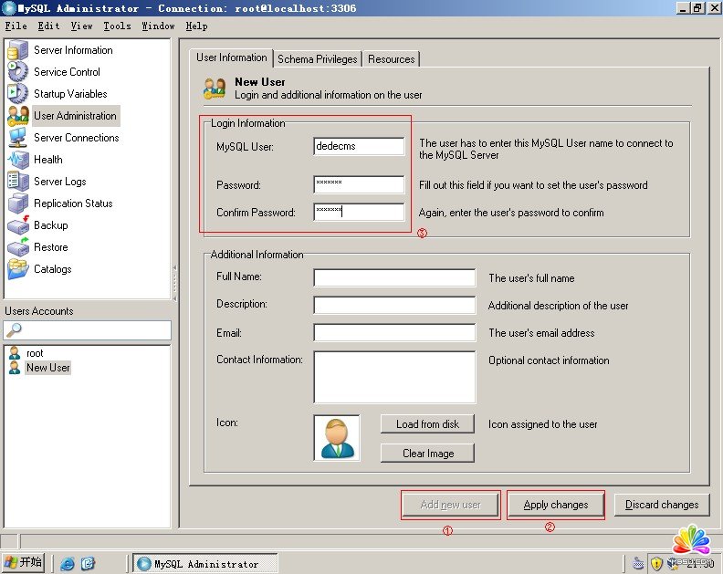 點擊圖22中紅框①處的數(shù)據(jù)庫“dedecms”,此時右側(cè)會出現(xiàn)權(quán)限,點擊紅圈②處得“<<”按鈕,為用戶“dedecms”授予“dedecms”數(shù)據(jù)庫的所有權(quán)限。然后點擊“apply changes”保存。點擊圖21中紅框②處的“apply changes”即可保存用戶。