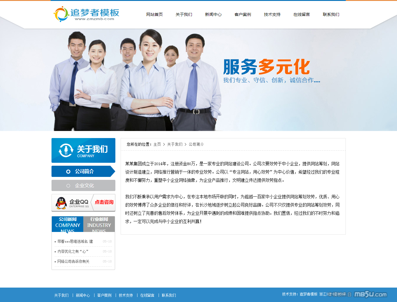 織夢dedecms大氣簡潔藍色集團企業(yè)公司通用網站模板,整體配色采用了非常大氣的藍色 ,首頁放置全屏大海報,非常有帶感,欄目頁包含了關于我們,新聞資 訊,案例展示,留言,聯系我們。基本上企業(yè)常用的一些欄目我們都已經做好了,而且代碼非 常的精簡,適合ESO優(yōu)化。模板基于DEDE CMS 最新版本5.7 UTF-8設計,5.5以上的版本應該都能使用。如果是GBK請自行轉換編碼。該模板是整站源碼,帶測試數據,安裝說明,安裝非常方便,只需要在后臺更改欄目為自己的信息就能輕松搭建自己的網站。