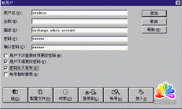 1.在Windows NT域用戶管理器中建立一個(gè)Exchange Server管理賬號(hào),比如名為"exadmin"。注意,一定要將此賬號(hào)添加到"Administrators"組中。如圖1所示。