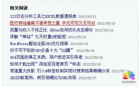 咱們都知道,在chinaz上如果一篇文章超過一千字的,那么左邊和右邊都沒內(nèi)容的,而當你看完一篇文章之后,如果沒有這個相關推薦閱讀版塊,你會怎么樣,難道每看完一篇往上拉一次還是直接退出頁面?答案是不言而喻的。所以,站內(nèi)優(yōu)化中,并非只要添加推薦閱讀版塊就行了,關鍵是要以用戶的角度去思考,相關推薦版塊應該添加在哪里,是左邊還是右邊,還是文章下面,咱們應該放到哪里才對提高用戶體驗最利的。