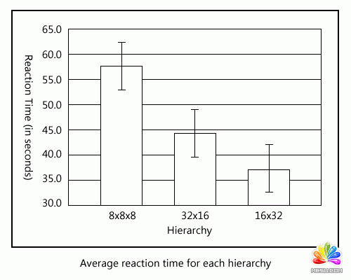 總共512項內(nèi)容,組成了三種不同的分級方案,X軸是分級,Y軸是反應時間(秒)。可以很清晰看出,在過深和過廣的分級方案上,用戶所需要的反應時間都比較長。因此我們在組織網(wǎng)站信息的時候,需要仔細平衡深度和廣度之間的關系。