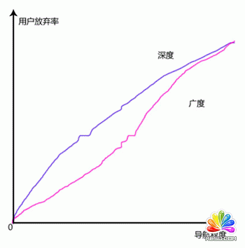 對于那些信息量很大很雜的網(wǎng)站來說,單純的使用某一種按類分組的方案已經(jīng)不太適用了。一般來說,廣度比深度的效果更好。在深結(jié)構(gòu)的各級別間選擇,比起在廣導航的各選項間掃視,要付出更多精力。眼睛比起鼠標點擊(和頁面載入)要快得多。雖然用戶在深結(jié)構(gòu)更容易迷失方向,甚至可能迷路,但也不要在廣度上走得太遠。任何時候都把所有鏈接展示出來會嚇倒用戶,讓他難以選擇。用戶會點擊看起來適合他們需要的第一個選項,或者干脆放棄,下圖清晰的闡述了用戶放棄率和深廣度之間的關系: