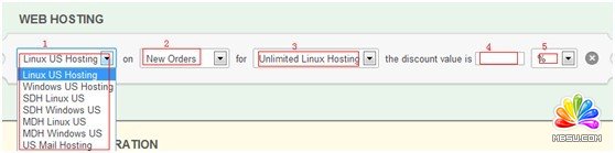 下拉菜單中,“1”包含了所有主機(jī)產(chǎn)品;“2”表示“New Orders”(新購(gòu)買);“3”表示列出每款主機(jī)產(chǎn)品下所有套餐;“4”處填寫產(chǎn)品折扣或具體價(jià)值,如10(%)或10(元);“5”則是與“4”相對(duì)應(yīng)的單位(% 或CNY)。
