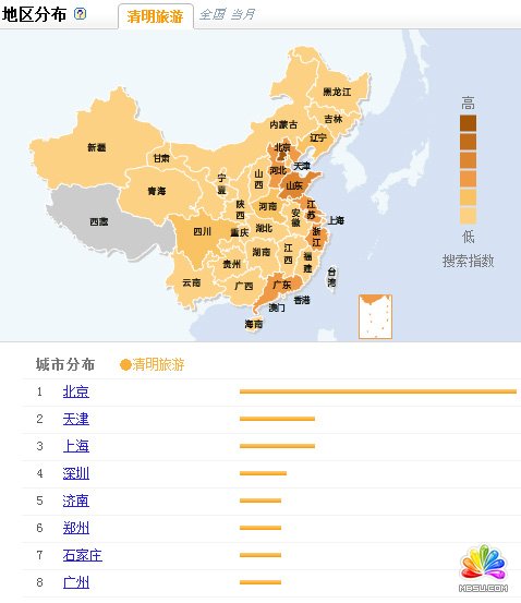 當然,還可以更加細分的挖 掘這個詞的潛力,例如我們的關(guān)鍵詞地域性,搜索的人群比例等等,例如看百度指數(shù)給我們的地域性比例提示可以看出北上廣這些大都市的搜索量依然很大,而前面 關(guān)鍵詞中提到的成都重慶等城市的潛力也是無窮,其中大家可以看出地區(qū)分布圖中比較高關(guān)注度的地區(qū)有北京,天津,上海,河北,山東,江蘇,浙江,廣東等地 方,其他地方對于清明旅游的關(guān)注度就要低得多: