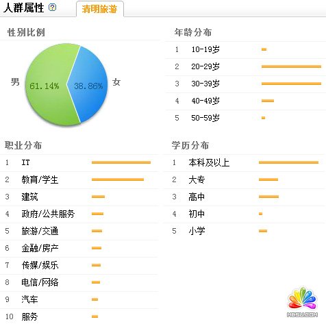 了解我們的客戶人群,可以針對性的做一些旅游推薦,相信這是每個網(wǎng)站都會主動去為用戶提升用戶體驗的一種方式,例如我們可以再清明旅游這個詞上看到大部分 搜索這個詞的人是20-40歲之間,IT和教育行業(yè)居多,有一定的旅游渴望居多,這類人追求品質(zhì)的生活,所以我們可以根據(jù)這些做一些定位和關(guān)鍵詞部署。例 如,馬蜂窩對于清明旅游做了一些推薦,其中尋花篇我感覺做的非常不錯,推薦的兩個地區(qū)都是旅游比較火的地方。
