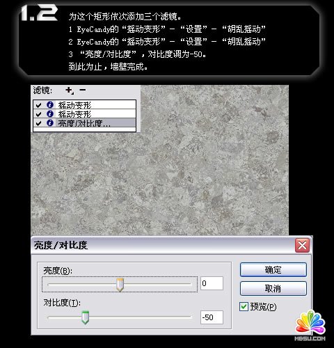 3 “亮度/對(duì)比度”,對(duì)比度調(diào)為-50。