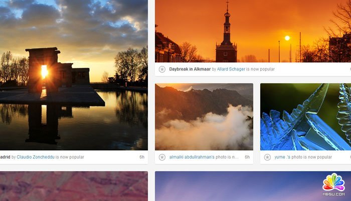 500px.com在傳統(tǒng)矩陣式平鋪布局基礎上掙脫圖片尺寸一致性束縛,圖片以基礎面積單元的1倍、2倍、4倍尺寸展現(xiàn)。大小不一致的圖片展現(xiàn)打破重復帶來的密集感,卻仍按照基礎面積單元進行排列布局,為流動的信息增加動感。不規(guī)則的圖片為瀏覽帶來樂趣,但由于視線的不規(guī)則流動,這樣的展現(xiàn)形式并不利于信息的查找。