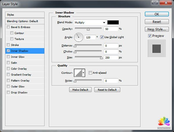2、給木紋圖層添加圖層樣式,選擇內陰影,參數(shù)及效果如下圖。