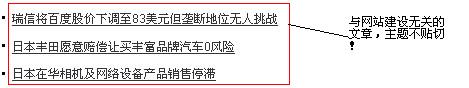 編輯網(wǎng)站內(nèi)容也是很考究站長個人技術(shù)的,不是自己想寫什么就寫什么,一個網(wǎng)站內(nèi)容要受到蜘蛛青睞,必定需要符合“主題貼切”這一個要素。舉一個簡單的例子吧,比如你的網(wǎng)站是搞網(wǎng)站建設(shè)的,你卻寫了一大堆與網(wǎng)站建設(shè)毫無關(guān)聯(lián)的文章,如下圖: