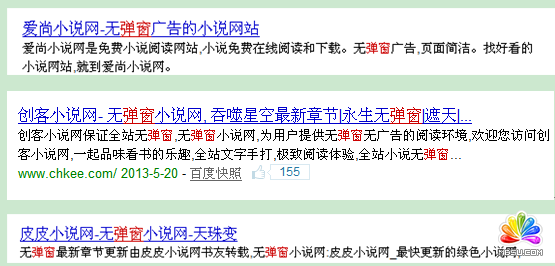 就小說站而言,小編隨機在百度搜索了一下,出現(xiàn)了好多無彈窗的小說網(wǎng)信息,看來“無彈窗”已經(jīng)成為小說站的“招牌”詞了。