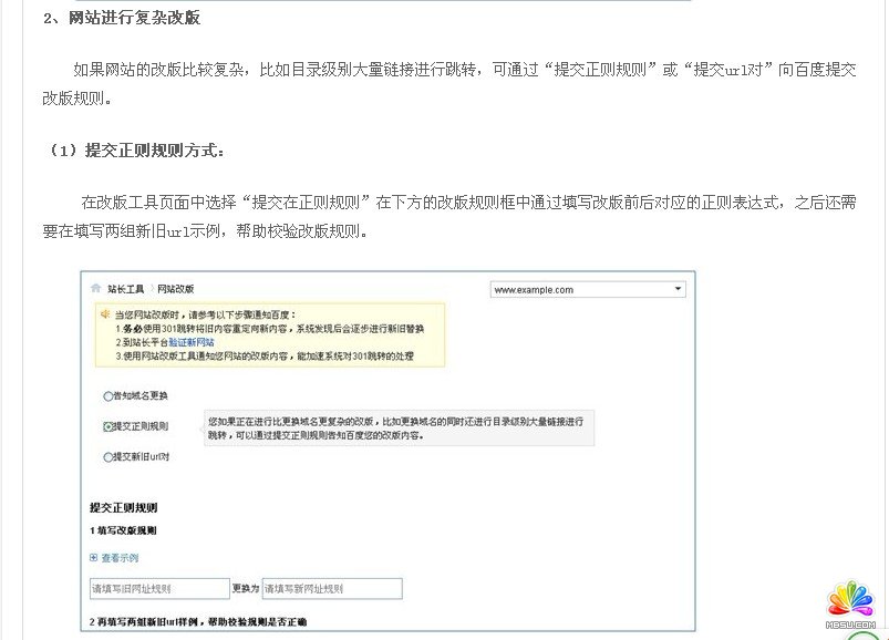 其次,網(wǎng)站進(jìn)行復(fù)雜改版的時(shí)候,域名更換可以,但是要是能保持網(wǎng)站的title、關(guān)鍵詞、描述之類的能保留的盡量不要改動(dòng),雖然現(xiàn)在百度平臺(tái)發(fā)布了很多對(duì)于這塊改版的升級(jí),但是個(gè)人覺得不到萬不得已,最好不要對(duì)于這些做出更改,畢竟搜索引擎對(duì)于熟悉的更有好感。但是由于升級(jí)改版工具,提交復(fù)雜改版域名的時(shí)候,我們就可以很好的利用提交正則規(guī)則方式了。畢竟大量目錄級(jí)別的鏈接跳轉(zhuǎn)是一個(gè)非常大的優(yōu)勢(shì)。