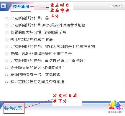(2)而次要欄目只是作為襯托主要欄目的存在,因此應(yīng)該把它們放在重要欄目的下方或者右方,形成如同眾星拱月的形狀,這樣才會讓用戶感到耳目一新,才會愿意去瀏覽你的網(wǎng)站。