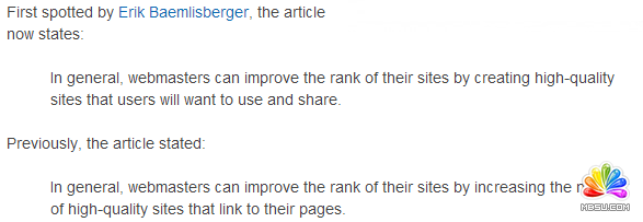 Google排名的新思想似乎某種程度上“鼓勵(lì)”了這種做法。在過(guò)去,Google的排名算法思想中很明確地提到了要注意“links”,而現(xiàn)在“links”似乎不再那么直白的被提及。Erik Baemlisberger,SEO界的知名專家,最先注意到Google的這種改變,在Google的Ranking Help文章中,有這樣的表述:“In general, webmasters can improve the rank of their sites by creating high-quality sites that users will want to use and share. (總體上,用戶喜聞樂(lè)見(jiàn)和樂(lè)于分享的高質(zhì)量網(wǎng)站能夠在排名上有更好表現(xiàn))”。而過(guò)去,同樣的這個(gè)文章的表述是:“In general, webmasters can improve the rank of their sites by increasing the number of high-quality sites that link to their pages. (總體上,為自己的網(wǎng)站帶來(lái)更多高質(zhì)量網(wǎng)站的鏈接,能夠增進(jìn)排名)”。二者的變化顯而易見(jiàn),如下圖所示: