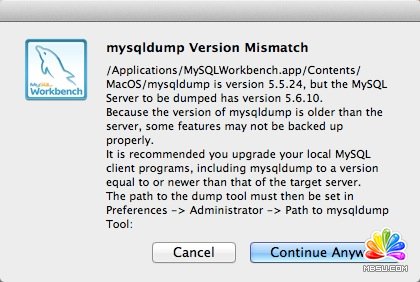 我想把本機(jī)數(shù)據(jù)庫(kù)內(nèi)的數(shù)據(jù)遷移到另一臺(tái)機(jī)器上,于是使用Workbench中自帶的import/export功能,其實(shí)就是調(diào)用mysqldump。不幸的是,出現(xiàn)了版本不一致的錯(cuò)誤。