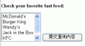 - 我認(rèn)為多選列表具有完美的功能只需按下Ctrl鍵,同時(shí)點(diǎn)擊鼠標(biāo)從列表中選擇多個(gè)項(xiàng)目。以下是一個(gè)典型的多選列表框: 上面那個(gè)列表框的代碼如下: form method=get action= bCheck your favorite fast food:/bbr/ SELECT MULTIPLE SIZE=5 name=favorites OPTION VALUE=McD