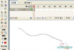 - 打開Flash,新建一個空白的Flash文檔。首先來畫帽子~選擇線條工具,先在場景中畫一條橫直線,然后用選擇工具把它變成曲線(這個變曲線的方法在葉子的繪制里有說了,不明白的就去看下吧~) 截個小動畫幫助大家理解曲線的制作~ 再次選擇線條工具,加多一條直線,且選擇工具