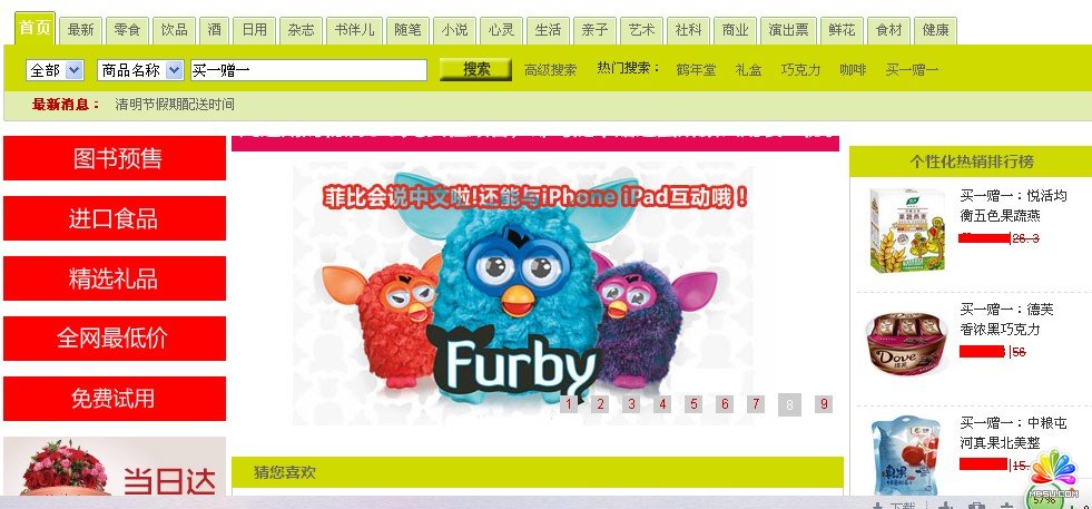 1,網(wǎng)站的主頁面,網(wǎng)站的整體色調(diào)是淡綠色,可能是與其節(jié)儉、低碳、綠色的服務(wù)理念有關(guān),本來綠色會(huì)使眼睛舒服的,但左面的那一列紅色分類又給整體減分,使頁面顯得凌亂,雖然每個(gè)電商網(wǎng)站都會(huì)展示很多商品,但色調(diào)的不統(tǒng)一,會(huì)使頁面更加眼花繚亂: