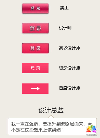 但很多UI設(shè)計(jì)師對此表示疑惑,如果全部設(shè)計(jì)都平面化了,那如果展現(xiàn)我的設(shè)計(jì)能力呢?那以后還要設(shè)計(jì)師干嘛?產(chǎn)品經(jīng)理就可以直接把效果圖設(shè)計(jì)完了。那我回答一下,這就是美工與設(shè)計(jì)師的區(qū)別,如果你有這個(gè)疑問,說明你只是一個(gè)美工,而且還沒達(dá)到一個(gè)高級設(shè)計(jì)師的級別。以下我通過一個(gè)按鈕的設(shè)計(jì)區(qū)分一下美工、設(shè)計(jì)師、高級設(shè)計(jì)師、資深設(shè)計(jì)師和首席設(shè)計(jì)師的區(qū)別。