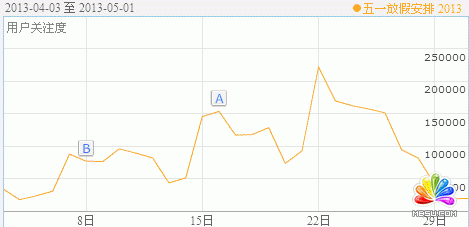 據(jù)觀察,搜索比較多的是“五一放假安排2013”,由圖中數(shù)據(jù)可以看出,指數(shù)高達(dá)25萬(wàn)!