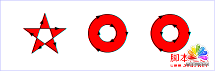 3. 稍微復雜一點的是fill-rule屬性。這個屬性定義了判斷點是不是屬于填充范圍的算法;除了inherit這個值外,還有兩個取值: evenodd:這個值采用的算法是:從需要判定的點向任意方向發(fā)射線,然后計算圖形與線段交點的個數,個數為奇數則改點在圖形內,需要填充;個數為偶數則點在圖形外,不需要填充�?聪聢D的示例: