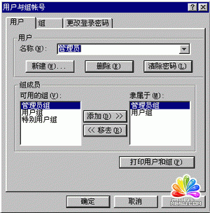 下面的這兩個組列表中,左面的是現(xiàn)在所有的組,而右面的則是在上面文本框中的這個用戶所在的組。通過中間的選擇按鈕就可以控制用戶所在的組了。不同的組可以有不同的權限,所有這樣管理以后,處于同一組中的用戶就有了同樣的權限了。