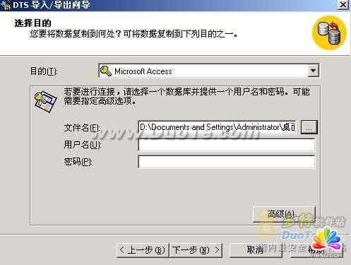 3.進(jìn)入導(dǎo)出到目標(biāo)數(shù)據(jù)源的選擇,這里我們要轉(zhuǎn)成ACCESS的數(shù)據(jù)庫。注意選擇數(shù)據(jù)源類型為“Microsoft Access。點(diǎn) “文件名(F)” 后面的按鈕選擇目標(biāo).MDB文件。