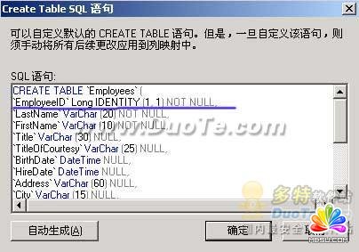 紅圈中的腳本就是employeeid 的 Access建表腳本,在 "NOT NULL" 前面加上 "IDENTITY (1, 1)"。