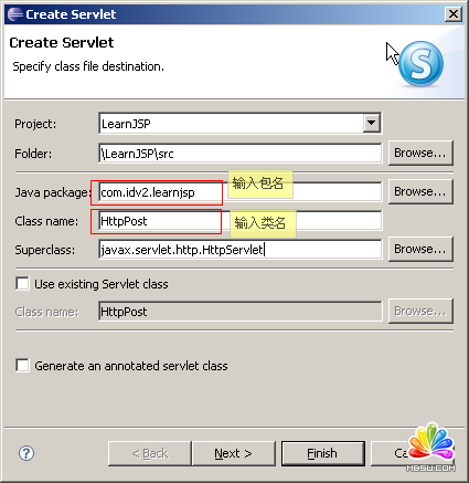 按照下圖的樣子,在Java package處輸入包名 com.idv2.learnjsp,在 Class name處輸入類名 HttpPost,單擊Next。