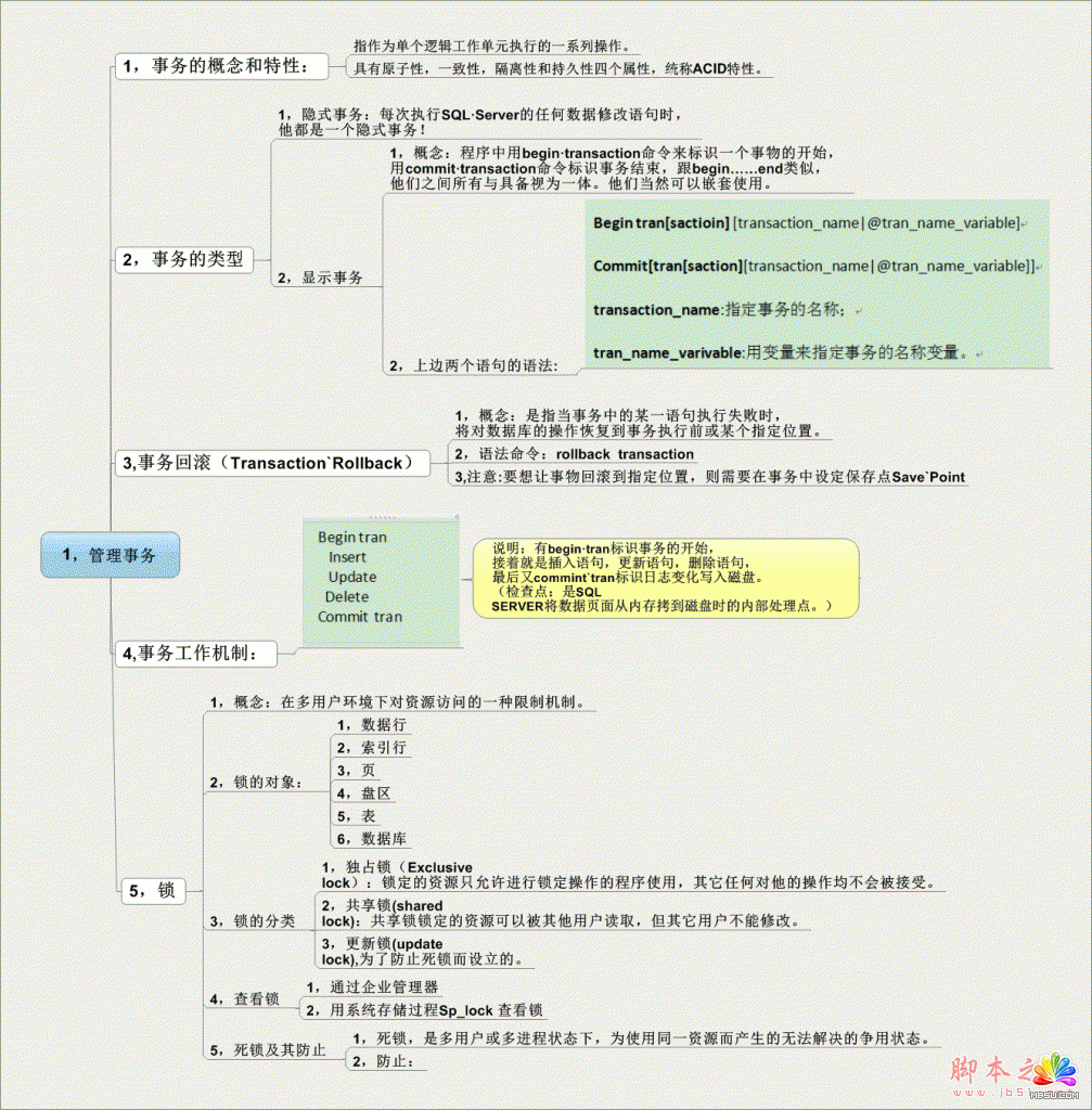 用SQL server 處理數(shù)據(jù)庫,主要就是和數(shù)據(jù)庫還有處理數(shù)據(jù)庫的事務(wù)打交道,如何管理好數(shù)據(jù)庫這個對象和處理數(shù)據(jù)庫的事務(wù)過程,是我們運用好SQL server非常關(guān)鍵的一點,下邊是我對管理事務(wù)和數(shù)據(jù)庫這章的總結(jié)。